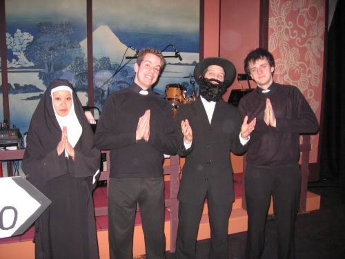 this weekend i went to scarborough with the Nunsense II crew....this play i've been in accompanying. there was a NODA conference and we had to put on a show for them on friday night and saturday night. i went with the band: Ian, Nikki (Ian's wife) Steven and Rick. cool people *thumbs up*. accomodation was provided. we stayed at the scarborough travel lodge or something along those lines. it was a bit much because...........since i was the only female in the band, i got a whole room to myself. but not only did i get just a whole normal room to myself........i got a whole friggin family room to myself. i had a choice of 3 beds to sleep in. OH DEAR!!!